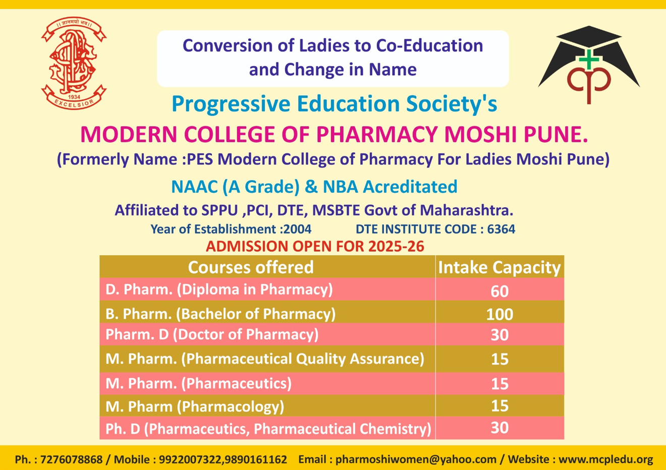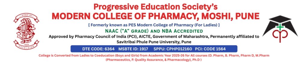 Progressive Education Society’s, Modern College of Pharmacy is approved by All India Council for Technical Education (AICTE), Pharmacy Council of India (PCI), Government of Maharashtra, and is affiliated to Maharashtra State Board of Technical Education (MSBTE), Savitribai Phule Pune University (SPPU) formerly known as the University of Pune. It is also accredited by NBA and NAAC.